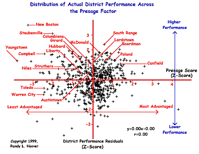 - Any district above the +1 mark above the x-axis is performing significantly better than average and better than would be expected. Youngstown City School District is a very good example of an Ohio district that has above average performance when we control for the effects of disadvantagement (Youngstown has the greatest level of disadvantagement of all the 593 districts studied.)