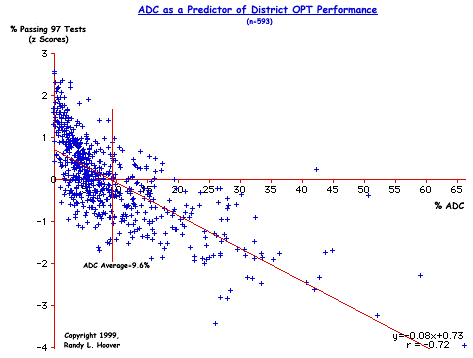 Given that ADC is clearly a measure of economic and social advantage-disadvantage, these findings strongly support the idea that the OPT is far more a measure of the lived experience of the student than a measure of what occurs in schools and classrooms. Expressed in terms of prediction, these data indicate that the percent of students in a school district receiving ADC is a powerful predictor of overall district performance: The greater the number of ADC students, the lower the percent passing.