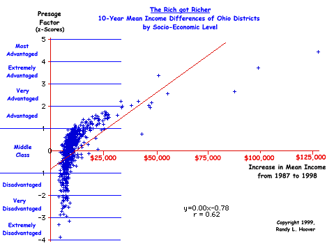 The graph below was an accidental by-product of the OPT/OSRC research study that was discovered as I was looking at mean district income and its relationship to test performance. It shows clearly how the upper classes have benefited from the legacy of Reaganomics by keeping the less advantaged from access to the vast wealth of this nation. It is important for educators to realize that the same political ideologues that brought us the new poor also brought us state proficiency testing and open disdain for all those connected with public teaching and public schooling.
