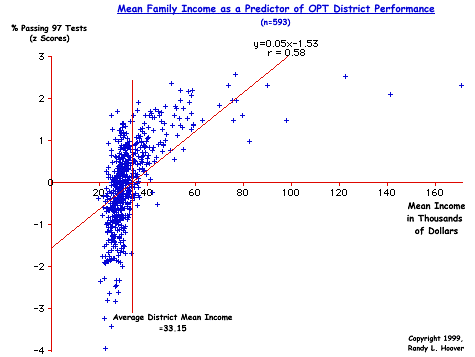 The graphing is also interesting from the standpoint that the association is non-linear as can be easily seen by observing the curved nature of the data points. This array tells us that the correlation coefficient is underestimating the actual correlation. In other words, we can be reasonable confident that mean family income predicts test performance more than this statistical operation indicates. As with the other tests of advantage-disadvantage in this study, mean income as a measure of advantage- disadvantage is powerful in predicting district performance thereby providing additional evidence that district OPT performance is far more a function of social-economic conditions than of classroom and school variables.
