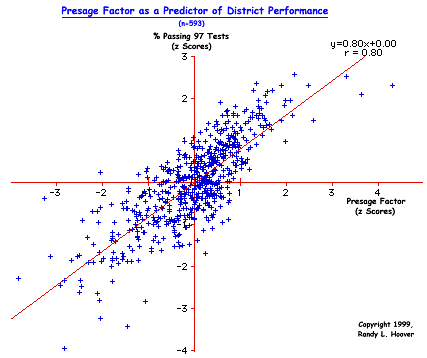 The "X" axis represents the Presage Factor converted into z-scores. The formula will be shown and discussed in class, but will not be released until the study is finalized and made public. From these data, a ranking of actual district performance is possible to calculate based upon the residual effects seen in the graph. Residuals represent the difference between how the district performs compared to how it is predicted to perform using the power of the Presage Factor. Actual or at least a much more accurate view of district performance may be seen when Presage effects are eliminated.