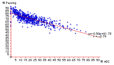Statistically speaking the inverse correlation between the percent ADC and the percent passing is extremely high. ADC is used as a measure of poverty where the fewer receiving ADC, indicates the greater the wealth of the community. So in this sense, we find one strong indication that economic condition of the family of the student is a strong predictor of whether or not the student will pass the Proficiency Test. The coefficient of determination for this regression analysis is 0 .62, extremely high and suggestive of ADC conditions being very significant in affecting how students in a given district score on the tests.