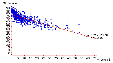 The following are graphic representations of regression statistics used to show the correlations between the precent of students passing the Proficiency Tests and other variables. Most simply put: The greater the correlation between two variables, the more the regression line will be at a 45 degree angle to either axis.Each graph shows the algorithm for the line created by comparing the two variables (yes, my students, it IS y=mx+b). Also shown is the correlation coefficient (r) which indicates, numerically, how close the correlation is. As the value of r gets closer to 1.0 or -1.0, the stronger the correlation. A perfect correlation would be where r=1.0 or r=-1.0. In the case where no correlation whatsoever exists, r=0. When there is a negative value for r, it signifies an inverse correlation. In the brief comments that follow each graph, the coefficient of determination R is given. R is derived from squaring r and suggests the degree of causality that may be associated from one variable to the other. It is extremely important to note that the coefficient of determination does not definitively establish causality, it is used to suggest the strenght of possible causality.