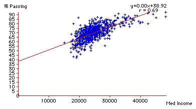 Figure 3 shows a strong correlation between median income and pass in the test. In the case of median income, please note that while I did the data analysis from which the graphs are generated, the data are taken from the Cincinnati Enquirer and that I did the statistically analysis from which these graphs are generated. My point is that median family income, while informative, does not substitute for mean family income correlation. To get a more thorough grasp of the effects of income, mean, median and mode incomes should be analyzed and compared. However, only data for median income were available. Median income can be a misleading average because a small number of famlies with significantly high incomes can distort the figure, making it seem higher than it is for families in general. However, even with this caveat, the data are striking in producing a correlation. coefficient of 0.69. The graph shows clearly that as the median family income goes up, so does the percent passing the Proficiency tests. I have done a simple, but somewhat interesting examination of the median income data itself, this can be found here.